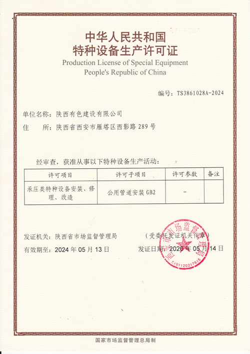 近日,經陜西省市場監督管理局審批,陜西省特種設備協會評審組現場鑒定評審,西安市市場監督管理局核準發布,公司新添中華人民共和國特種設備生產許可證——壓力管道GB2資質。